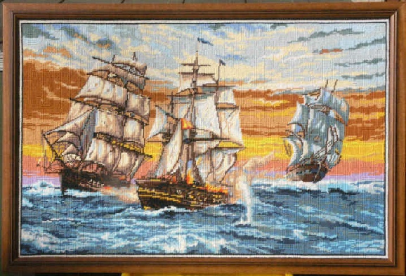 The Hornblower style Naval battle was started shortly after the completion of the Pharaohs in May 2002 and was finished in September 2003. It is 76cm by 49cm and used 600 metres of wool. With an estimated 57000 stitches in it, it took many hours to do.