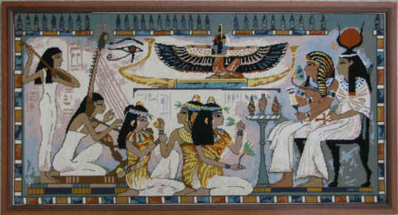 The Egyptian scene was started in July 2000 and completed in May 2002, it is the biggest yet and is 105cm in length by 54cm high. It used 80 skeins of Anchor wool.