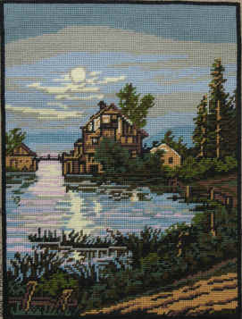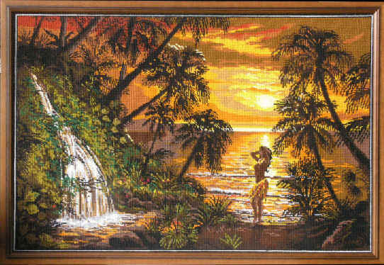From 2003 I worked on the tropical island sunset which I finished in October 2004. This is 92.5cm by 61.5cm and has an estimated 89,000 stitches.